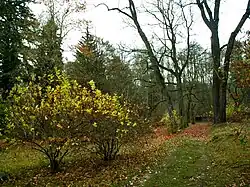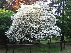 Další unikátem je stromový exemplář dřínu květnatého (Cornus florida).[15] Tento druh pocházejíci ze Severní Ameriky má zajímavé květenství s drobnými kvítky obklopenými čtyřmi až šesti velkými zákrovními bílými listeny. Méně známý, ale také významný je liliovník tulipánokvětý celolistý (Liriodendron tulipifera integrifolia), jediný jedinec svého druhu ve střední Evropě.[3] Dalšími zajímavými dřevinami jsou severoamerický zerav obrovský (Thuja plicata Lamb.), původní druh z výsadby v roce 1842, který dorůstá až 45 metrů, zeravinec japonský (Thujopsis dolabrata) také z doby založení zahrady, ořechovec plstnatý (Carya tomentosa), dub cesmínolistý (Quercus ilicifolia), korkovník amurský (Phellodendron amurense), halézie karolínská (Halesia karolina), jochovec olšolistý (Clethra alnifolia) nebo smrk východní (Picea orientalis).[3]
