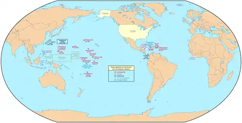 Roku 1947 byly Spojeným státům přidělena Mikronésie a Palau jako tzv. poručenské území Tichomořské ostrovy, tyto státy získaly nezávislost až v roce 1991, resp. 1994, přesto zůstávají závislé na USA v zahraniční politice a vojenských záležitostech.