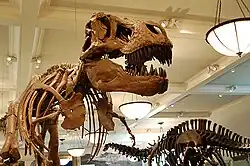 - Tyrannosaurus rex (exemplář AMNH 5027)[25]: Kostra je sestavena téměř úplně ze skutečných zkamenělých kostí v horizontální, vyvážené poloze, jako by kráčel. Kosti ve skutečnosti pocházejí ze dvou různých jedinců, které v Montaně v letech 1902 a 1908 objevil známý "lovec dinosaurů" Barnum Brown.[26]