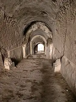 Aréna pro gladiátorské zápasy byla oproti okolí částečně zahloubena do terénu. Přístupná byla dvěma dlouhými, širokými a svažujícími se chodbami umístěnými na delších stranách elipsy. Obě chodby byly dlážděné a měly tunelovou klenbu. Aréna byla od míst k sezení oddělena zdí vysokou 2,18 metru. Na rozdíl od několika pozdějších amfiteátrů ten pompejský nemá podzemní prostory.