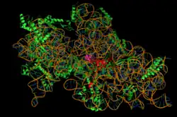 Struktura ribozomální podjednotky 30S svázané se streptomycinem (růžově ve střední části)