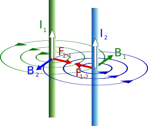 - Ampér je stálý elektrický proud, který při průchodu dvěma přímými rovnoběžnými nekonečně dlouhými vodiči zanedbatelného kruhového průřezu umístěnými ve vakuu ve vzájemné vzdálenosti 1 metr vyvolá mezi nimi stálou sílu o velikosti 2×10−7 newtonu na 1 metr délky vodiče.