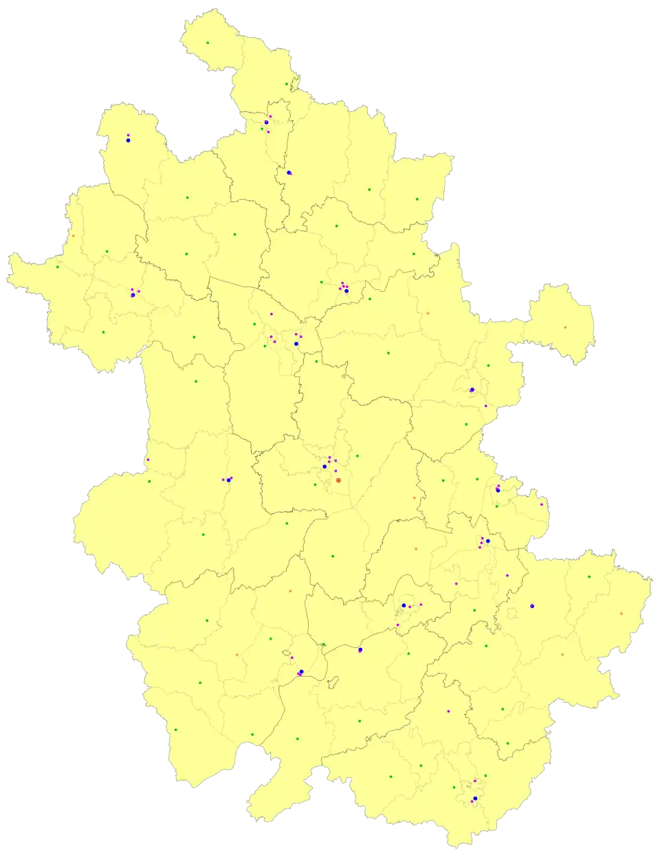 - ↑ a b c d e f g h i j k l m n o p q r s t 安徽省 (Provincie An-chuej). 百度百科 (Encyklopedie Baidu) [online]. [cit. 2023-07-14]. Dostupné online.