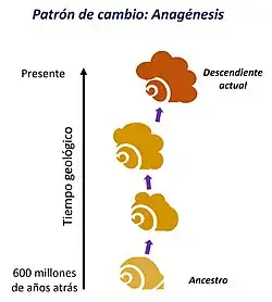 Navzdory tomu se však v průběhu generací může i u jediné vývojové linie organismů nahromadit takové množství změn, že lze výslednou novou formu považovat za samostatný druh vzniknuvší procesem anageneze. Tento spíše teoretický fenomén nese především v paleontologii pojmenování fyletická speciace.[1] Příkladem je například evoluce amerických bizonů: obří druh pleistocenního bizona, bizon širokočelý (Bison latifrons), se vlivem klimatických změn vyvinul do menší formy Bison antiquus, žijící před asi 20 000 až 10 000 lety, jež dala později vzniknout moderním bizonům americkým (Bison bison).[3]