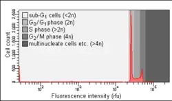 Analýza buněčného cyklu je aplikací metody průtokové cytometrie. Umožňuje rozlišit buněčnou populaci na skupiny podle fáze buněčného cyklu. Metoda je založená na kvantifikaci buněčné DNA, jejíž množství se mění během jednotlivých fází [1]. Před replikací (fáze G1; G0) je množství DNA u diploidního organismu rovno 2n. Během fáze replikace (S) dochází k zdvojování DNA a množství DNA je >2n. Další fáze, G2 obsahuje množství DNA 4n, stejně jako buňky na počátku mitózy (fáze M). Naměřená data se prezentují ve formě histogramu, kde je vynesen počet buněk proti množství DNA.