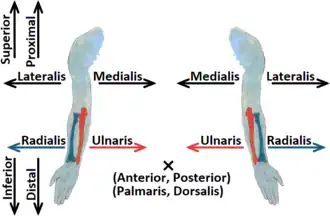 Pojmy medialis a lateralis se užívají na paži nebo stehnu. Na předloktí a ruce se místo nich užívají ulnaris a radialis. Na bérci a noze se místo nich užívají tibialis a fibularis.