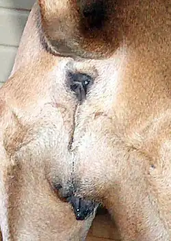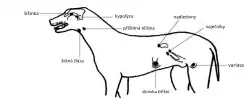 - ↑ BUDRAS, Klaus-Dieter; FRICKE, Wolfgang; MCCARTHY, Patrick, a kol. Anatomy of the Dog (Vet)): An Illustrated Text. [s.l.]: Schlutersche, 28.9.2007. 224 s. ISBN 3899930185. Kapitola 3. Body wall, prepuce and mammary glands, s. 32. (anglicky)