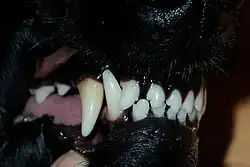 Špičáky psa jsou dlouhé, jednokořenové a mohutné zuby, horní špičáky zapadají do prohlubně v dolním pysku, dolní špičáky mezi horní krajáky a horní špičák. Kořeny špičáku mohou být až dvakrát delší než korunka. Jejich funkce je jak mechanická – horní špičáky pomáhají udržet horní pysk vně tlamy a dolní drží jazyk uvnitř tlamy – hlavně jsou ale uzpůsobeny k uchopení kořisti či nepřítele a k utrhávání tkáně. První premolár v horní čelisti je malý zub, který svou přítomností pravděpodobně dále zpevňuje fixaci špičáků v čelisti. Trhákový komplex složený z největších premolárů a molárů slouží ke krájení kusů masa a drcení kostí. Poslední stolička M3 je malá a nemá větší význam. Psi nemají schopnost žvýkat potravu a v dutině ústní ji rozmělnit na malá sousta, kusy potravy polykají vcelku.[18]