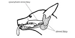 Do mordy ústí také slinné žlázy. Pes má stejně jako člověk tři velké slinné žlázy: příušní žlázu (gl. parotis), podjazykovou žlázu (gl. sublingualis polystomatica et monostomatica) a podčelistní žlázu (gl. submandibularis), ale také malé slinné žlázy v podslizničním vazivu, přičemž tvářové malé slinné žlázy jsou nahloučené do žlázy jařmové (gl. zygomatica).