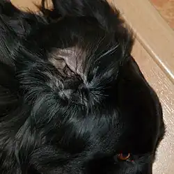 - anální váčky (sinus paranalis) jsou párové váčkovité duté útvary, 5–30 mm velké,[53] v jejichž stěně se nacházejí komplexy apokrinních žláz. V blízkosti vývodů se vyskytují i ojedinělé holokrinní žlázy. Vývody váčků ústí na přechodu análního kanálu a okolní kůže přibližně v pozici čtyři a osm hodin. Svalovina ve stěnách váčků umožňuje jejich kontrakci a vyprázdnění – stává se tak mimovolně při stresu a během defekace. Silně páchnoucí, žlutý, žlutohnědý nebo hnědý sekret ulpívá na výkalech.