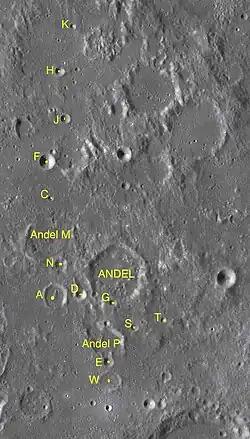 V okolí kráteru se nachází několik menších kráterů. Ty byly označeny podle zavedených zvyklostí jménem hlavního kráteru a velkým písmenem abecedy.