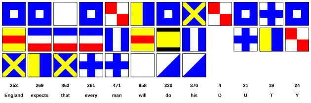 Signál byl přenášen pomocí numerického vlajkového kódu známého jako Telegraphic Signals of Marine Vocabulary vytvořeném roku 1800 kontradmirálem sirem Homem Pophamem, založeném na dřívějším signálním kódu admirála lorda Howea.[7] Howeův kód se zakládal na číslech od 1 do 9 na celkem deseti signálních vlajkách. Tyto vlajky v různých kombinacích představovaly číselné kódy, jež byly zapsány v seznamu šifer. Kniha šifer byla součástí výbavy každé lodi Britského královského námořnictva a každá byla opatřena olověným závažím, aby mohla být v případě zajetí lodi hozena přes palubu. Předpokládá se, že číselný kód musel být jeden po druhém vytahován na stěžeň spolu s „telegrafickou vlajkou“, která signalizovala, že jde o kódy Pophamovy šifry.[8]