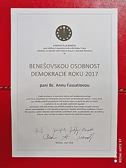 V roce 2017 obdržela Anna Fassatiová od předchozích benešovských starostů a místostarostů mimořádné uznání za svou obětavou práci a v roce 2018 byla jako druhá žena na návrh veřejnosti oceněna titulem „Osobnost benešovské demokracie“ (viz Benešov - Osobnosti).[25]