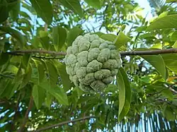 Gyneceum květu má volné plodolisty, které po opylení postupně srostou a vytvoří zelenožlutý, nepravý plod šupinovitého vzhledu o průměru 5 až 10 cm, sestavený ze segmentů s jedlou dužinou a jedovatými semeny. Ovoce bývá kulaté, oválné nebo je kuželovitého tvaru, má tuhou kůži složenou z knoflíkových segmentů barvy světle zelené, šedozelené, modrozelené i růžové. Segmenty se od sebe oddělí při plné zralosti a odhalí krémově bílou, lesklou, šťavnatou, voňavou, sladkou dužinu. Semena jsou tmavě hnědá, oválná, asi 1,5 cm velká a ovoce jich může obsahovat až čtyřicet. Některé stromy mají plody bezsemenné.[2][3][5][6][7]