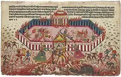 Širokou oblibu si v Indii získaly dva rozsáhlé hrdinské eposy, Mahábhárata a Rámájana, které vznikly postupným spojováním a nabalováním epizodických příběhů přibližně od poloviny 1. tisíciletí př. n. l. Rámájana je starším z obou eposů, kratším (24 000 strof) a ucelenějším, byť i ona obsahuje množství dějových odboček. Vypráví příběh Rámy a jeho manželky Síty. Ráma musí odejít se svou chotí nespravedlivě do vyhnanství, kde je Síta unesena démonem Rávanou na jeho ostrovní sídlo. Konflikt se rozřeší až rozsáhlým válečným tažením, při kterém Rámovi pomůže opičí bůh Hanumán. Aby Síta dokázala, že se svému muži během zajetí nezpronevěřila, podstoupí zkoušku ohněm a vyjde z ní nedotčena. Mahábhárata, velké vyprávění o válce Bharatovců (rozdělených na znepřátelené rody Kuruovců a Pánduovců) čítá plných sto tisíc dvojverší a patří mezi nejrozsáhlejší epická díla na světě. Zahrnuje vložených příběhů a epizod a na mnohé z nich je možné narazit také ve starších dílech indické slovesnosti. Její významnou součástí je také Bhagavadgíta, Píseň Vznešeného, obsahující množství různorodých filosofických myšlenek, přičemž primárně je věnována způsobům, jak dosáhnout osvobození z koloběhu zrození a smrti.[9]