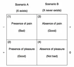 Pokud někdo existuje, existuje i přítomnost bolesti a přítomnost potěšení. Pokud někdo neexistuje, není přítomna bolest ani potěšení, přičemž absence potěšení však v důsledku neexistence vědomí nemůže být vnímána jako deprivace. Benatar v tomto argumentu uvádí bolest a potěšení pouze jako příklady dobrého a špatného v životě, obdobně by se dalo formulovat i pro další věci, které vnímáme jako negativní a pozitivní. Pro Benatara „by jakékoliv utrpení stačilo, aby byl příchod do existence újmou“ a újma, kterou příchod do existence způsobí, je podle něj vyhnutelná a zbytečná. Podle Benatara je dobré vyhnout se újmě vždy, kdykoliv je to možné, a proto je vždy dobré nepřijít do existence.
