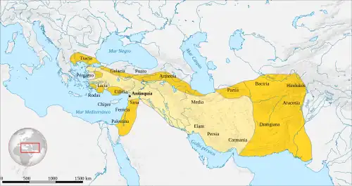 Seleukovská říše ( světle žlutě ) v době nástupu Antiocha III. Velikého, tmavě žlutá území představují jeho válečné výboje.