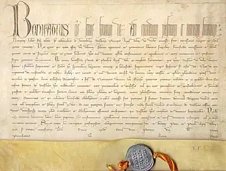 Ad perpetuam rei memoriam. Antiquorum habet fida relatio, quod accedentibus ad honorabilem Basilicam Principis Apostolorum de Urbe concessae sunt magnae remissiones, et Indulgentiae peccatorum. Nos igitur qui iuxta officij nostri debitum salutem appetemus, et procuramus libentius singolorum, huiusmodi remissionem, et Indulgentias omnes, et singulas, ratas, et gratas habentes, ipsas auctoritate Apostolica Confirmamus, et approbanus. Ut autem Beatissimi Petrus, et Paulus Apostoli eo amplius honorentur, quo eorum Basilicae de Urbe devotius fuerint a fidelibus frequentatae, et fideles ipsi spiritualium largitione munerum ex huiusmodi frequentatione magis senserint se refertos; Nos de Omnipotentis Dei misericordia, et eorundem Apostolorum eius meritis, et auctoritate consisi, de Fratrum nostrorum consilio, et Apostolicae plenitudine potestatis, omnibus in praesenti anno millesimo trecentesimo a Festo Nativitatis Domini Nostri Iesu Christi praeterito proxime inchorato, et in quolibet anno centesimo secuturo, ad Basilicas ipsas accedentibus reverenter, vere poenitentibus, et Confessis, vel qui vere poenitebunt, et consistebuntur, in huiusmodi praesenti, et quolibet centesimo secuturo annis, non solum plenam, et largiorem immo plenissimam omnium suorum concedemus, et concedimus veniam peccatorum. Statuentes, ut qui voluerint huiusmodi Indulgentiae a nobis concessae fieri participes, si fuerint Romani, ad minus triginta diebus continuis, seu interpolatis, et saltem semel in die, si vero Peregrini fuerint, aut Forenses, simili modo diebus quindecim, ad Basilicas easdem accedant. Unusquisque tamen plus merebitur, et Indulgentiam efficatius consequetur, qui Basilicas ipsas amplius, et devotius frequentabit. Nulli ergo, etc. Datum Romae apud S. Petrum 8 Kal Martij Pontificatus nostri anno sexto.[2]