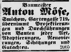 - ↑ a b Národní archiv, Policejní ředitelství I, konskripce, karton 389, obraz 472:Möse Anton