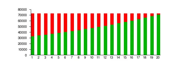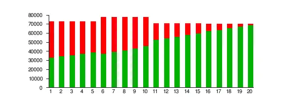 Při pevné lhůtě splatnosti jsou splátky konstantní pouze za předpokladu pevné úrokové míry po celou dobu splácení. To je splněno u úvěrů ze stavebního spoření, kde bývá výše úroku stanovena pevně již při podpisu smlouvy o spoření. Graf uvedený níže ukazuje průběh splácení půjčky ve výši 1 miliónu na 20 let při pevném úroku 4%[3] a výši úmorové a úrokové složky v jednotlivých rocích při měsíčním splácení.