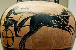 Na 70. olympijských hrách v roce 500 před Kr. byly do programu jezdeckých soutěžních disciplín zařazeny závody na vozech tažených párem mul.[3] Pausanias uvádí, že závody čtyřkolových vozů tažených mulami nebyly starou jezdeckou disciplínou a u diváků byly neoblíbené, neboť muly byly v očích Éliďanů nehezká, opovrženíhodná zvířata, nad nimiž spočívala pradávna kletba.[4] Pro tento divácký nezájem byla tato soutěžní disciplína již na 84. hrách v roce 444 před Kr. zrušena.[2][3]