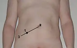 Schéma vyhledání McBurneyova bodu, který leží na spojnici pupku a spina iliaca anterior superior, ve vzdálenosti 2/3 od pupku