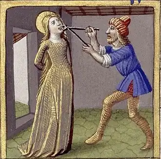 | Atributy | v ruce kleště s vytrhnutým zubem, někdy s korunou na hlavě, dále zuby, dláto, nůž, hořící hranice, palmová ratolest |