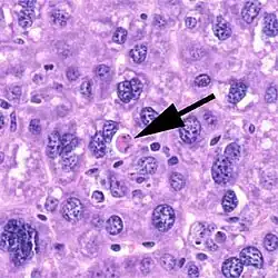 - Pyknóza chromatinu (kondenzace do kompaktních shluků),[12][13] načež proběhne karyorrhexe (tzv. internukleozomální štěpení DNA do relativně malých úseků)[14] a následný rozpad jádra (karyolýza)[9]
