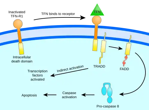 TNF je cytokin produkovaný zejména aktivovanými makrofágy. Obvykle bývají TNF receptory, přítomné na buňce, dvojího typu: TNF-R1 a TNF-R2. Vazba TNF na jeden z těchto receptorů má za následek aktivaci kaspáz, a to přes určité prostředníky (TRADD, FADD, TRAF2).[34][35] Fas receptor (také Apo-1 či CD95) se po navázání na Fas ligand[33] změní na tzv. DISC („death-inducing signaling complex“), který aktivuje kaspázu 8 a kaspázu 10. Kaspáza 8 pak obvykle aktivuje další kaspázy, které nevratně směřují k smrti buňky.[36] Fas ligandy se uplatňují ve velké roli v imunitním systému, protože se nachází na povrchu cytotoxických T-lymfocytů a mohou tak indukovat apoptózu u vybraných buněk. Mimoto mají tyto T-lymfocyty rovněž Fas receptor, který se může navázat na Fas ligand na té samé buňce a způsobit tak řízenou apoptózu opotřebovaných T-lymfocytů. Nádorové buňky toho někdy využívají, jelikož mohou obsahovat na svém povrchu Fas ligand, a tak mohou indukovat buněčnou smrt u T-lymfocytů, jejich „protivníků“.[28] Zvláštní způsob apoptózy, naprosto nezávislý na kaspázách, řídí molekula AIF (apoptosis-inducing factor).[37]