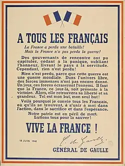 V tomto článku byl použit překlad textu z článku Appel du 18 Juin na francouzské Wikipedii.