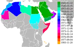 Jediný člen Ligy, který byl svrchovaným státem dlouho před svým vstupem, je Omán (samostatný od roku 1650). Většina ostatních států se stala členy Ligy krátce po získání nezávislosti, v některých případech jen několik týdnů či dokonce dní (viz tabulka). Na druhou stranu některé státy (včetně zakládajících států Jordánska a Sýrie) vstoupily do Ligy ještě před získáním vlastní svrchovanosti.[12] Roku 1976 se členem stala také Organizace pro osvobození Palestiny,[8] kterou roku 1988 nahradil jednostranně vyhlášený Palestinský stát, dnes zastupovaný Palestinskou národní samosprávou.[13]