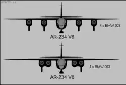 Následující prototyp Ar 234 V8 (Werk-Nr.130 008, GK+IY) byl poháněn čtyřmi turbokompresorovými proudovými motory BMW 003 A-0 umístěnými ve zdvojených gondolách pod křídlem.