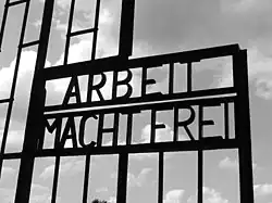 Nápis „Arbeit macht frei“ byl umístěn u bran mnoha nacistických koncentračních táborů jako „jakési mystické prohlášení, že sebeobětování v podobě nekonečné práce může přinést jakousi duševní svobodu.“[2]