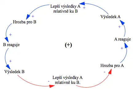 Jedna velká posilující smyčka (výsledek spojení dvou rovnovážných smyček) u archetypu eskalace