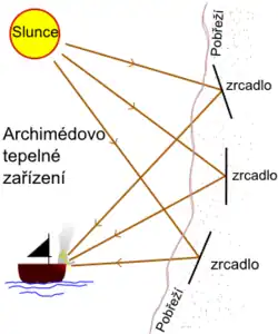 Ve 2. století syrský spisovatel Lúkianos napsal, že při obléhání Syrakus (asi 214–212 př. n. l.) Archimédés zapaloval nepřátelské lodě na dálku.[33] Z pozdější doby (6. století) se dochovalo Anthémiovo tvrzení, že k tomu použil zrcadel.