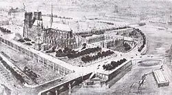 ![]() Katedrála Notre-Dame s arcibiskupským palácem v roce 1827 | |