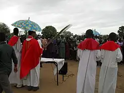 ![]() Americký senátor John Kerry přijímá svaté přijímání při zvláštní mši pro referendum v katolické katedrále Kator, 9. ledna 2011 | |