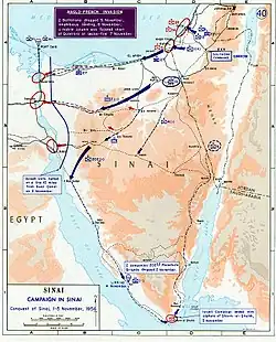 Koncem července 1956 Egypt znárodnil Suezský průplav a uzavřel Tiranskou úžinu, která Izrael spojuje s Rudým mořem. Její uzavření Izrael považoval za casus belli (tj. událost postačující k vyhlášení války).[38][p 4] Ben Gurion s Dajanem následně zahájili tajná jednání s Francií a Spojeným královstvím – do té doby totiž Suezský průplav spravovala britsko-francouzská společnost, z nichž vzešla dohoda o izraelsko-britsko-francouzském útoku, známém jako sinajská válka.[39] Podmínkou Britů nicméně bylo, že Izrael nezaútočí na Jordánsko. Plán spočíval ve využití výsadkářů, a jejich vysazením poblíž průsmyku Mitla a Suezského průplavu, a obrněných jednotek, a jejich postupu dvěma směry: západním po pobřežní silnici k průplavu a jižním podél Akabského zálivu k Šarm aš-Šajchu.[39] Podle dohodnutého scénáře (tzv. Sèvreský protokol) měl Izrael při vojenském tažení obsadit celý Sinajský poloostrov a dostat se až 16 kilometrů od průplavu.[40] V tom okamžiku měla zasáhnout Francie se Spojeným královstvím, jež budou požadovat stažení obou válčících stran z prostoru průplavu, a v případě nevyslyšení ultimata budou intervenovat.[40]