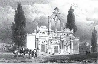 Podle nápisu vyrytého na ciferníku hodin byl chrám založen v roce 1587 Klimisem Chortatsisem. Architektura stavby je silně ovlivněna renesančním uměním, neboť kostel byl postaven v době, kdy byla Kréta kolonií Benátské republiky. V menší části průčelí kostela, tvořené čtvercovými bloky pravidelného cihlového zdiva, jsou hlavním prvkem čtyři dvojice korintských sloupů. Ačkoli je zde patrný klasický antický vliv, samotné sloupy, umístěné na vyvýšených podstavcích, jsou gotické a mezi každým párem sloupů se nachází oblouk. Dva oblouky na koncích průčelí podpírají dveře a kruhový otvor, který je po obvodu zdoben palmovými listy, oblouk uprostřed průčelí je prostý. Ve vyšší části fasády, nad sloupy, je řada lišt a eliptických otvorů, které jsou po obvodu rovněž zdobeny palmovými listy. Uprostřed jsou hodiny a na obou koncích gotické obelisky.
