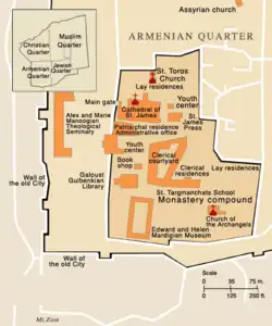 - Katedrálou je kostel sv. Jakuba v Arménské čtvrti v Jeruzalémě. Současným patriarchou je Nurhan Manougian.