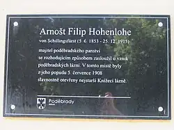 Za první republiky město shromáždilo prostředky na stavbu památníku knížeti Hohenlohe, jeho stavba se ale neuskutečnila kvůli změněným politickým a hospodářským poměrům.[11] Zásluhy Filipa Arnošta Hohenlohe na založení poděbradských lázní tak připomíná alespoň pamětní deska umístěná u vchodu do budovy Letních lázní v dnešní Lázeňské ulici.