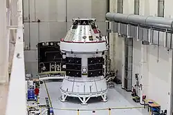Pokud jde o kosmickou loď Orion, ta v bezmála finálním stavu podstoupila na konci roku 2019 a začátkem roku 2020 čtyřměsíční testování ve středisku NASA v Ohiu a poté se vrátila zpět do KSC k dokončovacím pracím.[30] Firma Lockheed Martin plně dokončenou loď předala k integraci s nosnou raketou 16. ledna 2021.[35] Předstartovní servis byl zahájen kontrolou a naplněním nádrží Orionu palivem v únoru a březnu 2021.[36] V červenci 2021 technici loď doplnili o startovní záchranný systém a 8. září dokončili instalaci 4 aerodynamických krytů obepínajících loď v prvních minutách při startu.[37]