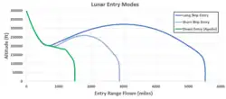 - návrat do atmosféry s „odskokem“ (NASA zkouší návrat, při kterém se modul vnoří do horních vrstev zemské atmosféry, krátce z ní vyletí a teprve napodruhé provede kompletní vstup do atmosféry),