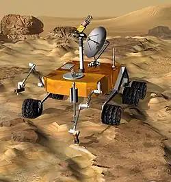 Představa automatické sondy na povrchu Marsu hledající stopy mimozemského života