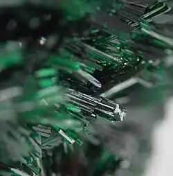 - Optické vlastnosti: Barva zelená v nejrůznějších odstínech, obvykle smaragdově zelená až černozelená, lesk diamantový až skelný, průhledný až jen průsvitný, vryp jablečně zelený.