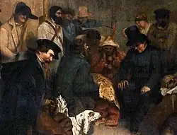 Levá část obrazu zobrazuje lidi, kteří ve svém těžkém životě hledají úkryt v materialismu, vášních či víře – tedy většina obyvatelstva tehdejšího světa, lidé žijící „všední” život. Courbet tuto stranu popsal jako „svět obyčejného života, tedy lid, bídu, chudobu, bohatství, vykořisťované i jejich vykořisťovatele”. Více než konkrétní osoby se zde nacházejí symboly.