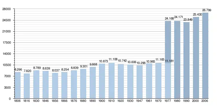 - Zdroj: NIS. Poznámka: údaje z let 1806 až 1970 včetně jsou výsledky sčítání lidu z 31. prosince; od roku 1977 se uvedený počet obyvatel vztahuje k 1. lednu