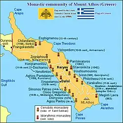- Pantokrator – byl založen v 2. pol. 14. st. mnichem Joanikiem (podle jiného zdroje: dvěma dvořany byzantskými).
