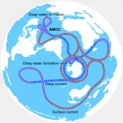 Atlantická meridionální cirkulace (AMOC) je součástí globální termohalinního výměníku v oceánech a je zónově integrovanou složkou povrchových a hlubinných proudů v Atlantském oceánu. Všeobecná termohalinní cirkulace je vzorec proudění vody ve světových oceánech. Teplá voda proudí podél hladiny, dokud nedosáhne jednoho z několika zvláštních míst v blízkosti Grónska nebo Antarktidy. Tam voda klesá a pak se po stovky let plazí po dně oceánu v hloubce několika kilometrů a postupně stoupá v Tichém a Indickém oceánu. Severní povrchové proudění přenáší značné množství tepelné energie z tropů a jižní polokoule směrem k severnímu Atlantiku, kde se teplo ztrácí do atmosféry v důsledku silného teplotního gradientu. Při ztrátě tepla se voda stává hustší a klesá. Toto zhuštění spojuje teplé povrchové rameno se studeným hlubokým zpětným ramenem v oblastech konvekce v Severním a Labradorském moři. Větve jsou také propojeny v oblastech vzdouvání, kde divergence povrchových vod způsobuje Ekmanovo sání a vzestupný tok hluboké vody.