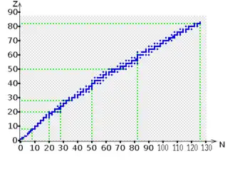 Z diagramu je vidět, že pro nebo neexistují stabilní nuklidy. Podobně neexistují stabilní nuklidy pro . Také neexistují stabilní nuklidy pro nukleonová čísla .